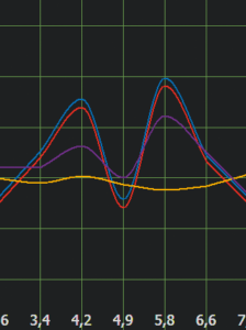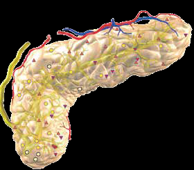 Organebene Bauchspeicheldrüse: Soll-Kurven (optimal) blau/rot; Ist-Kurven des Patienten gelb/lila